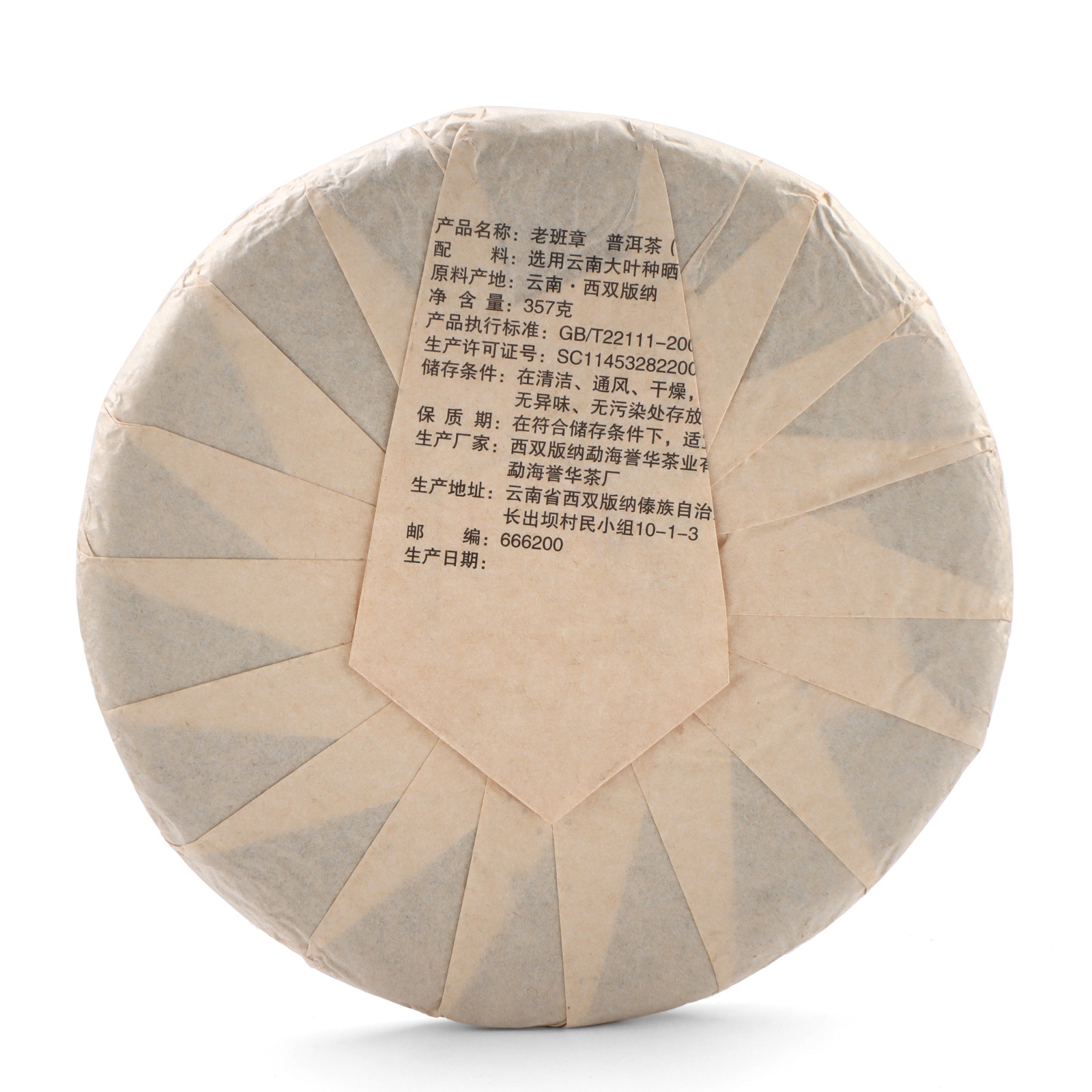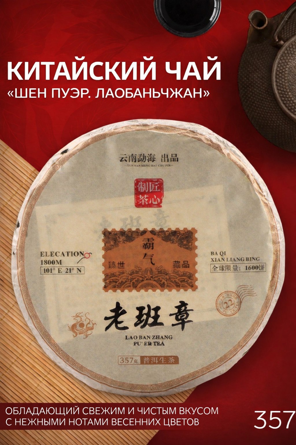 Чай зелёный китайский Шен Пуэр. Лаобаньчжан, Мэнхай, 2021 г, блин, 357 г